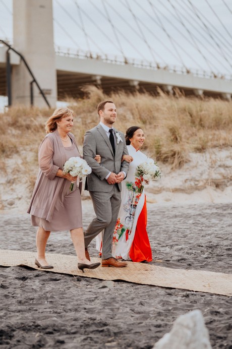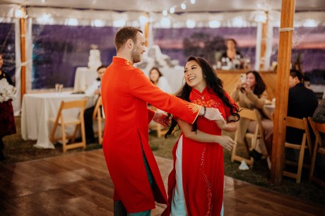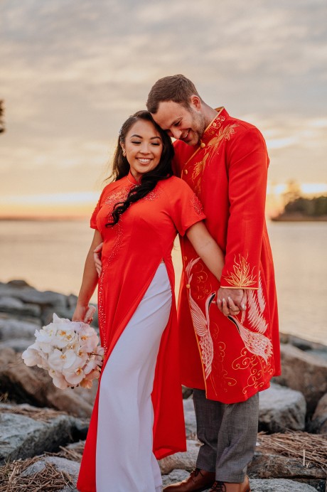 The bride’s family wore traditional Vietnamese garments (“Áo dài”), which the couple also changed into for their reception.