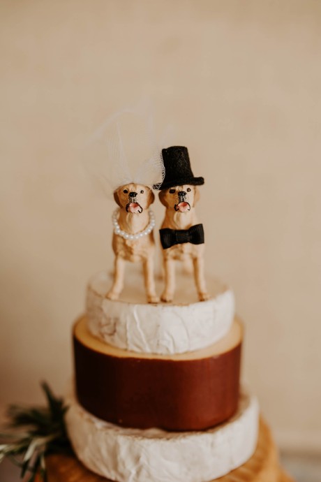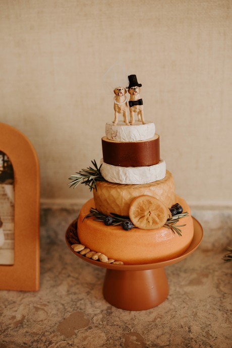 Rather than a traditional cake, the couple opted to create a "cheese cake" made of stacked wheels of various cheeses in different sizes.