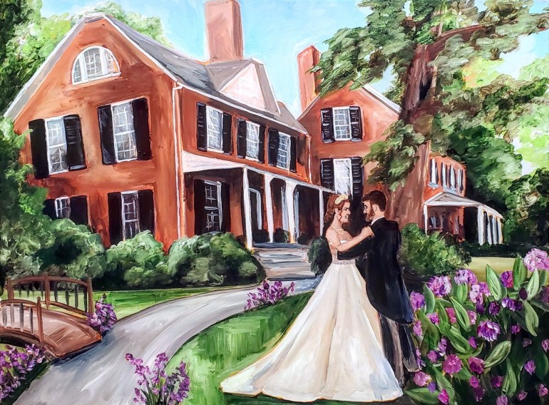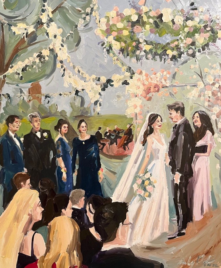 While each of these souvenirs are as pragmatic as they are poignant, there’s another service in which couples can commission a keepsake that fully captures the emotional core of the day, by preserving a meaningful moment in a newlywed’s journey with nothing but paint and a blank canvas full of possibilities.
