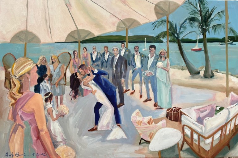 For Andy, that first chat is when she shares her creative process, becomes enchanted by the couple’s love story and discusses the available options, such as canvas size, their preference of watercolors or oil, and if they’d like a single piece or two. During the final weeks leading up to the wedding, there’s a second concept meeting via video-chat in which all of the details — including the special moment the couple wants depicted — are finalized.