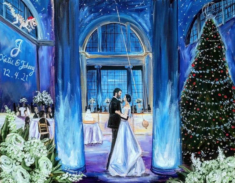 “Many of my couples love their venue’s ceremony space but ultimately want their first dance painted. And so I’ll often paint them in a first-dance pose, but within the ceremony space,” said Brittany. “That way, both elements that they love are cohesively captured together.”