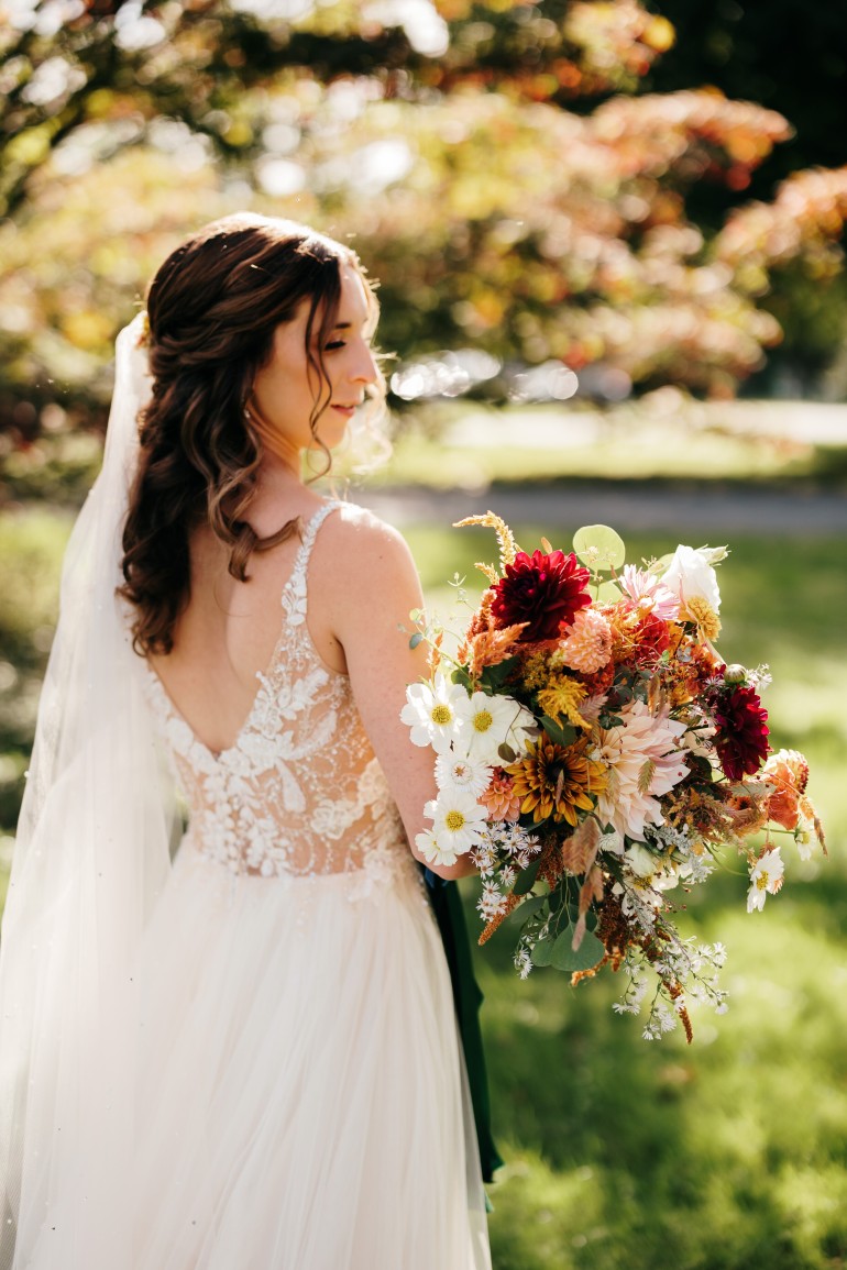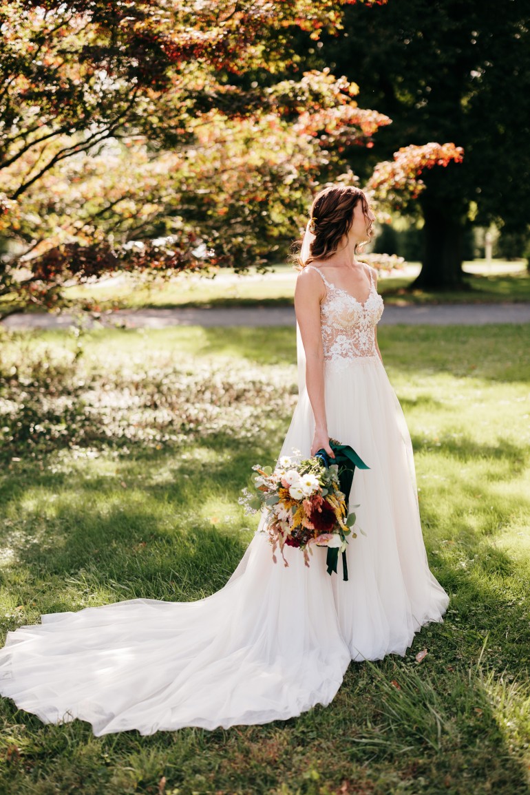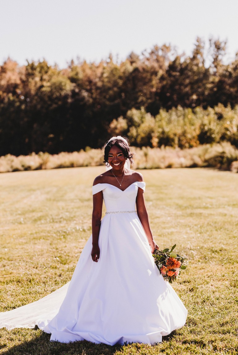 A-Line:  Possibly the most popular style on our list due to its forgiving shape and overall comfort, A-line gowns flow from the neckline down to a full skirt. For a more fitted style throughout the bodice, but still creating that “A” shaped silhouette, look for a modified A-line.