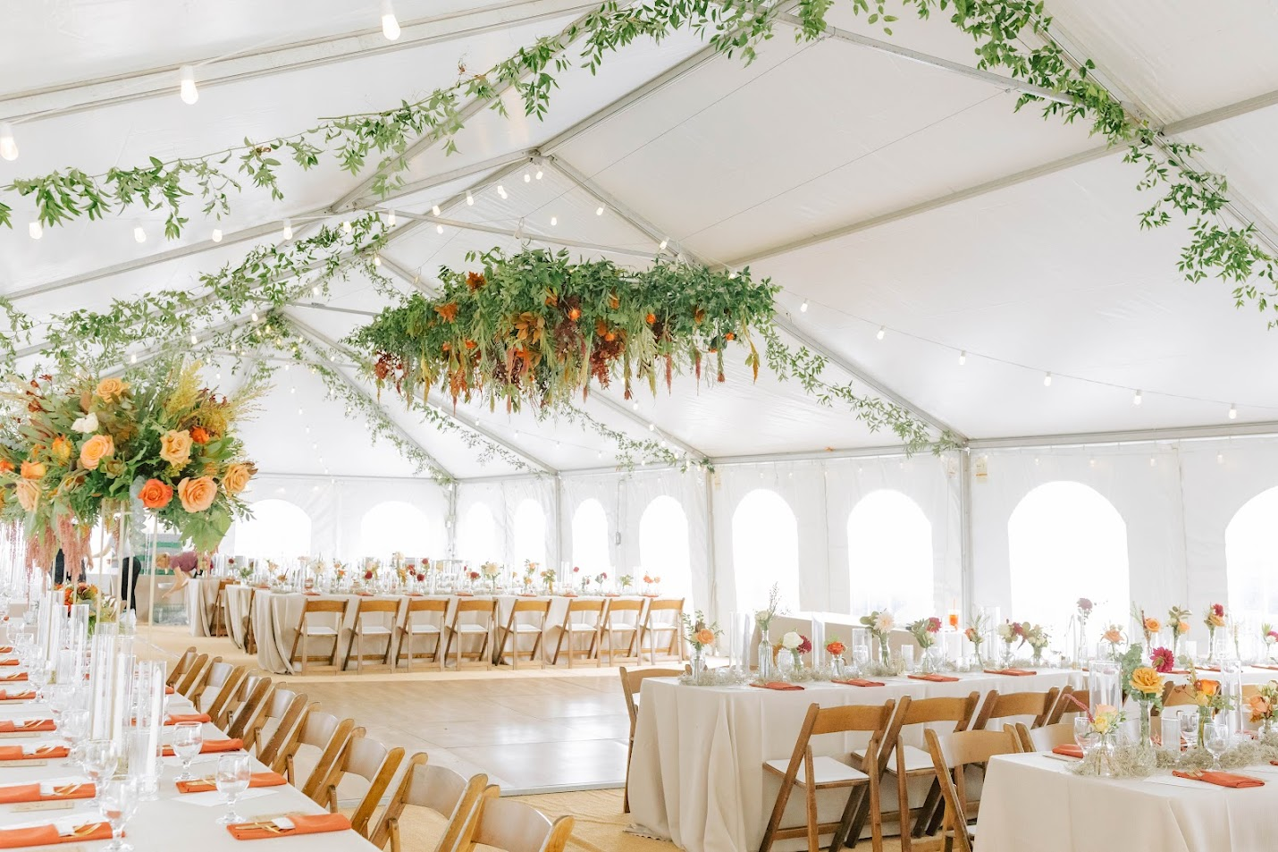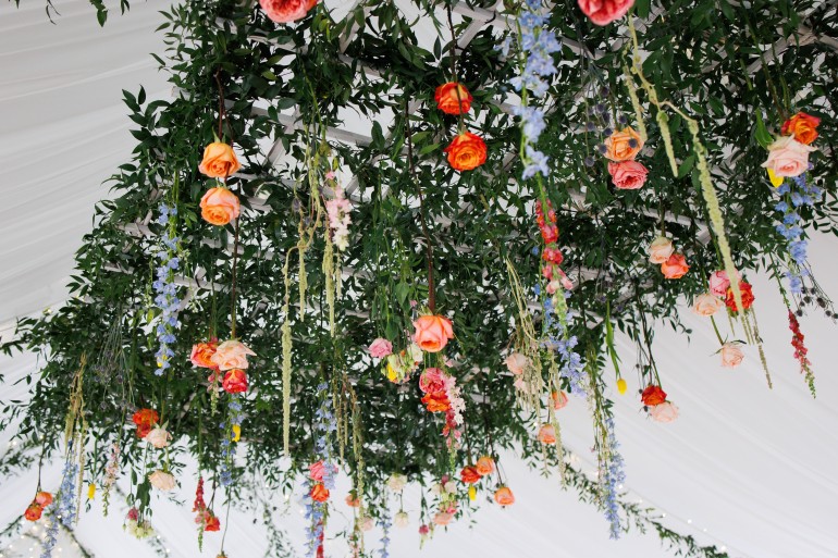 And it’s not just the flowers and greenery you’re paying for. There’s also the price of labor and construction materials, not to mention how it’s being built—are they creating rooms out of fabric or entire structures by hand? While you may be dreaming of flower chandeliers and upside-down gardens, keep in mind there may be limitations based on your venue. “A lot of venues don’t like us attaching things to their ceilings and walls. This means we have to create our own structures to hang things from, and size can be a limitation there as well. We love working in a tent because there are no restrictions!”