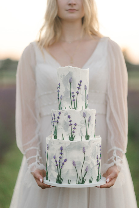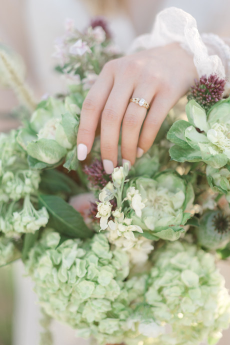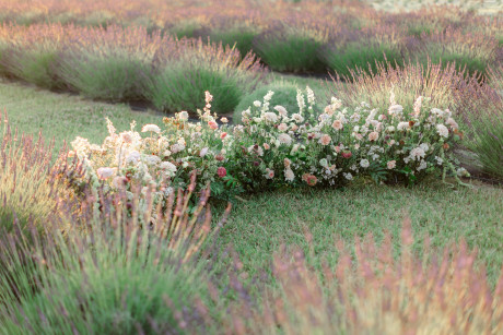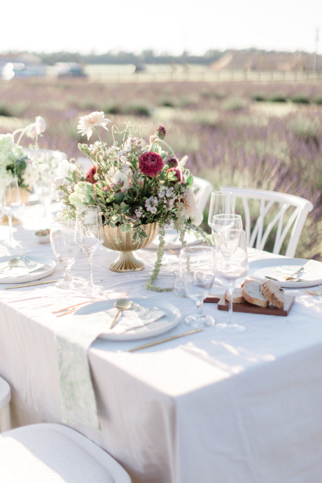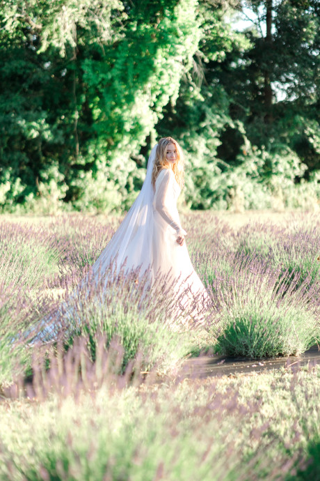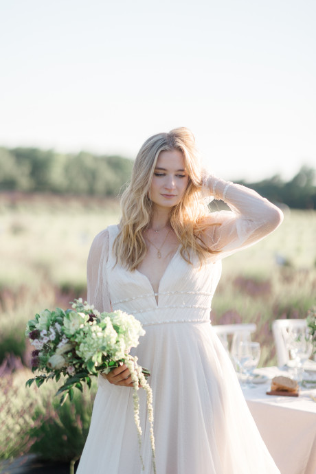 “Grace, green, and gardens were the inspiration for this elegant but natural themed bridal shoot at Brittingham Farms, a lavender wedding venue tucked just beyond the Delaware shoreline. Garden greens graced the table settings, and a flowy bridal gown complemented the surrounding farmland, while the bright lavender fields and the setting sun served as an elegant, but organic backdrop.” – Mo Garratt