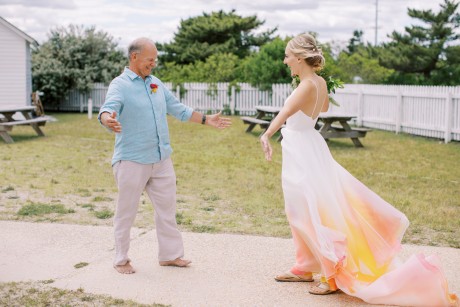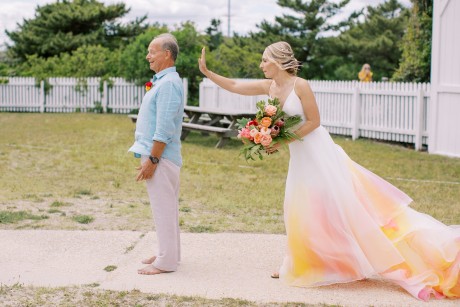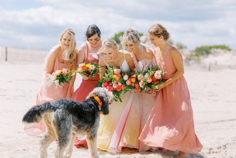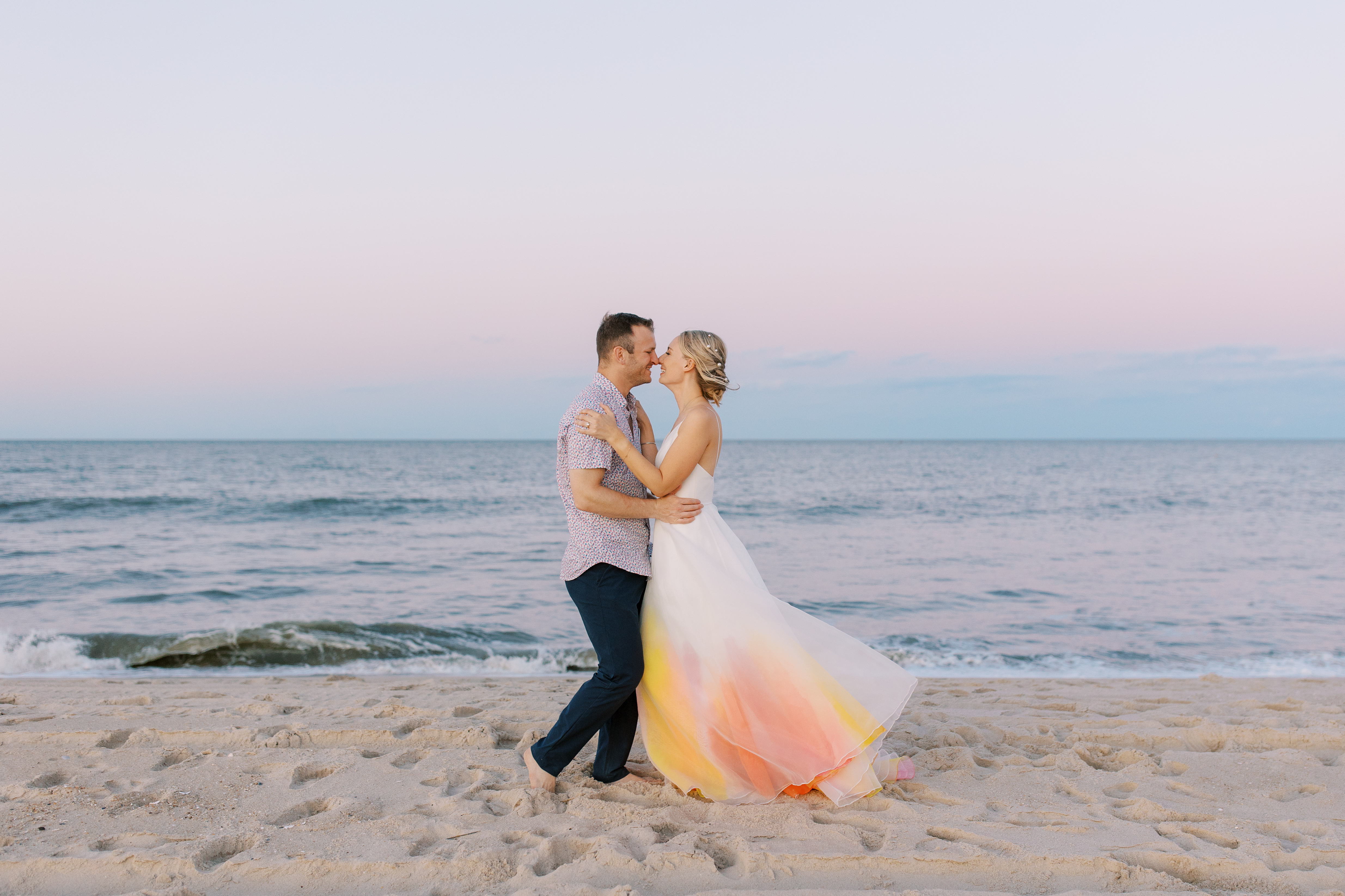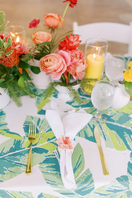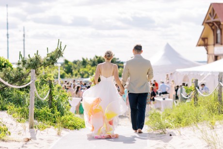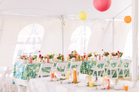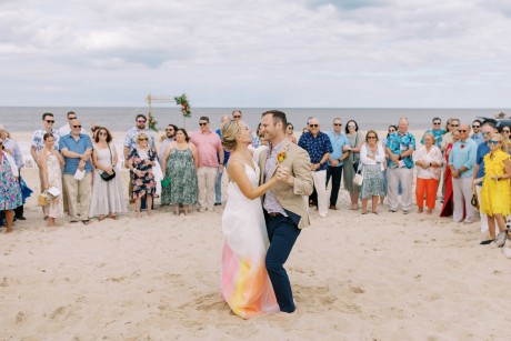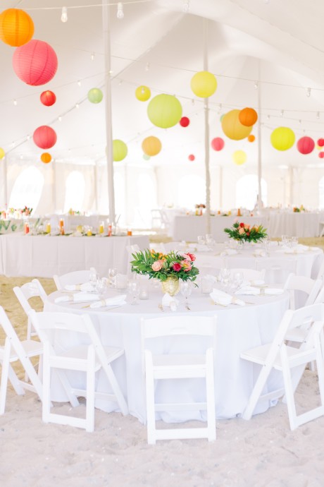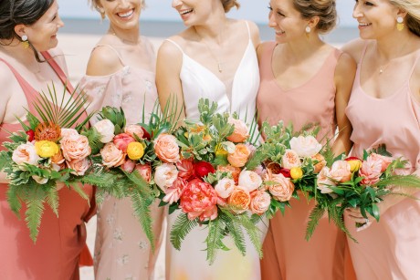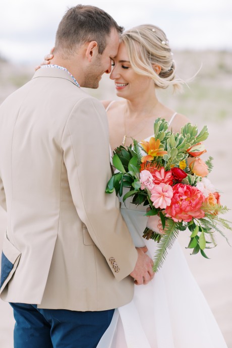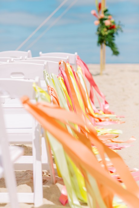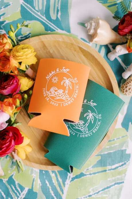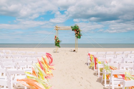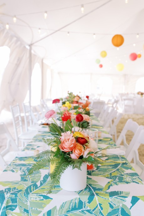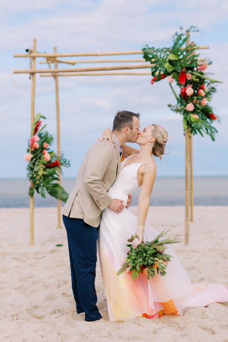 "My husband, Jeff, and I wanted a colorful beach celebration full of our favorite people. We were officially married on a boat in the Caribbean (the initial wedding plan was postponed due to COVID-19), but we still wanted to have a celebration and so we brought tropical touches to the big wedding too. We asked that our guests wear bold bright colors and tropical prints—and they did not disappoint. We also recommended that folks go barefoot to fully embrace the beach vibes.