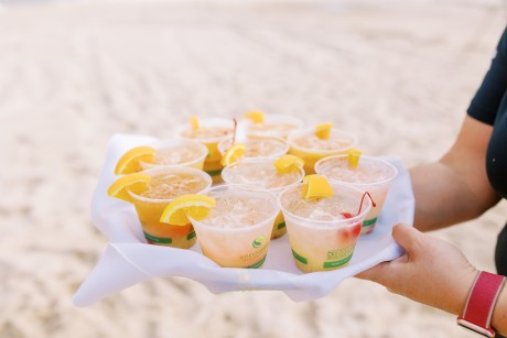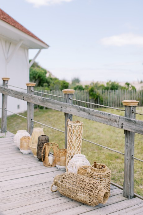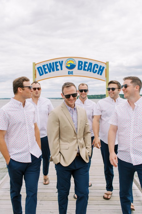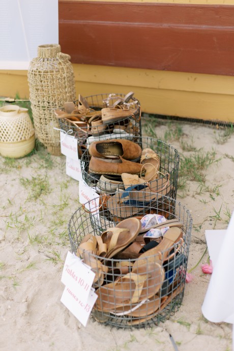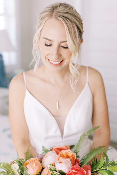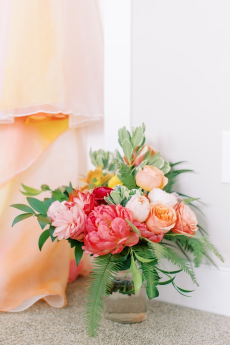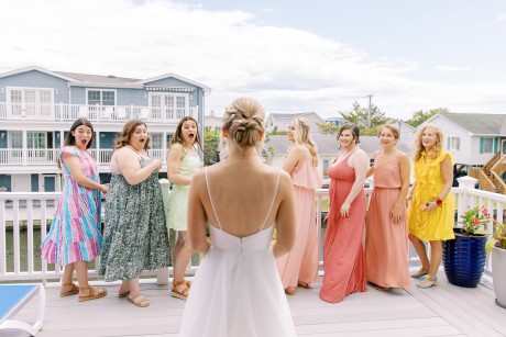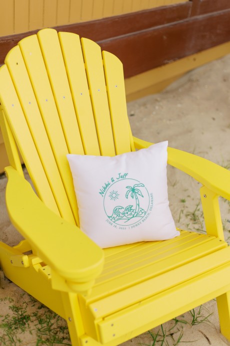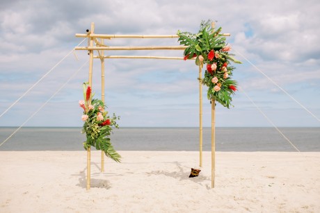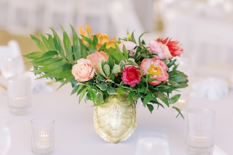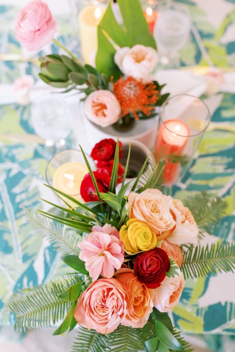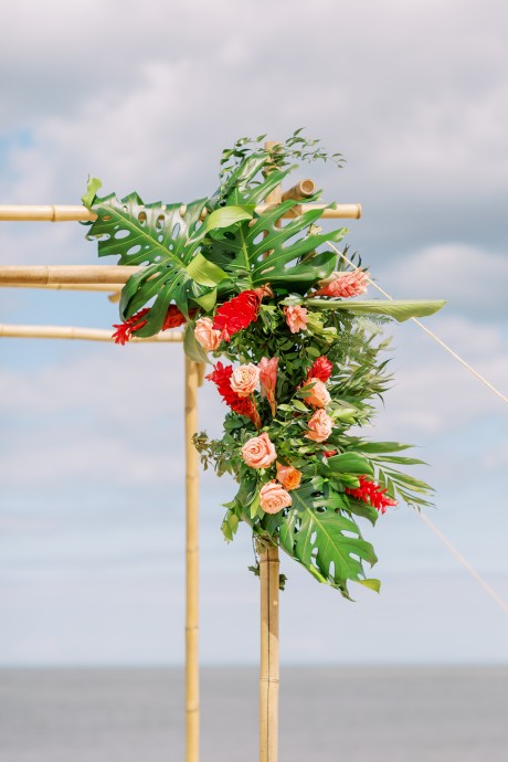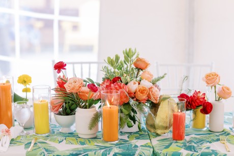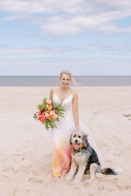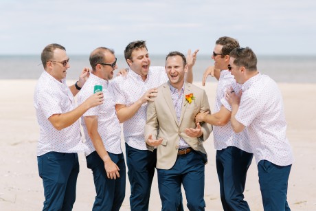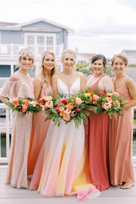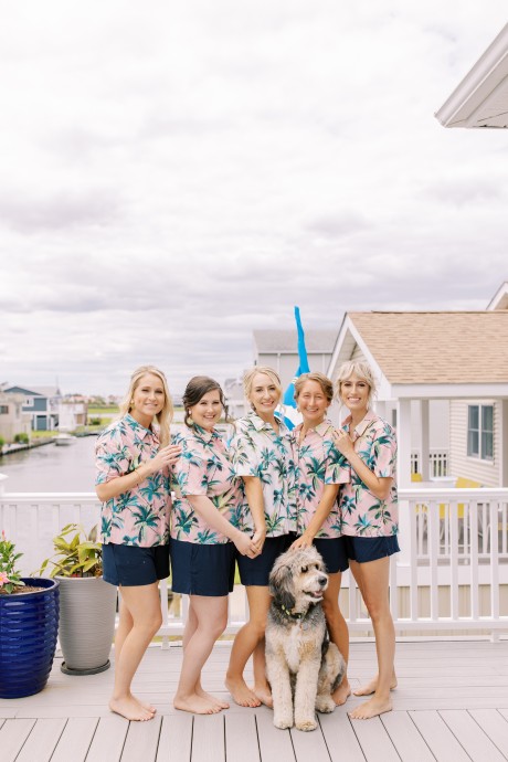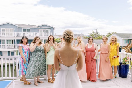 "My husband, Jeff, and I wanted a colorful beach celebration full of our favorite people. We were officially married on a boat in the Caribbean (the initial wedding plan was postponed due to COVID-19), but we still wanted to have a celebration and so we brought tropical touches to the big wedding too. We asked that our guests wear bold bright colors and tropical prints—and they did not disappoint. We also recommended that folks go barefoot to fully embrace the beach vibes.