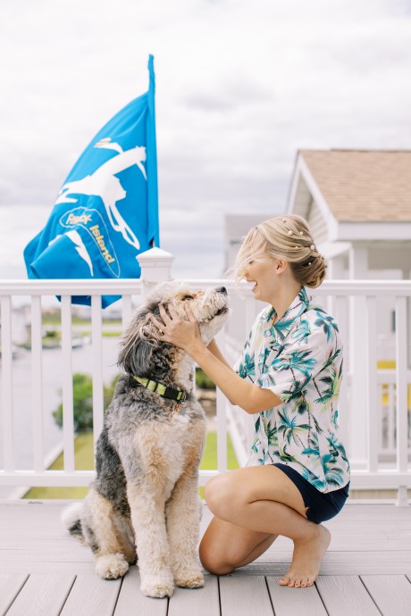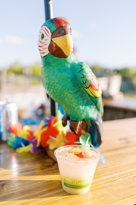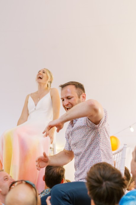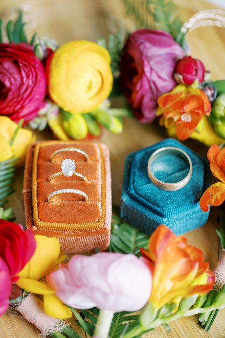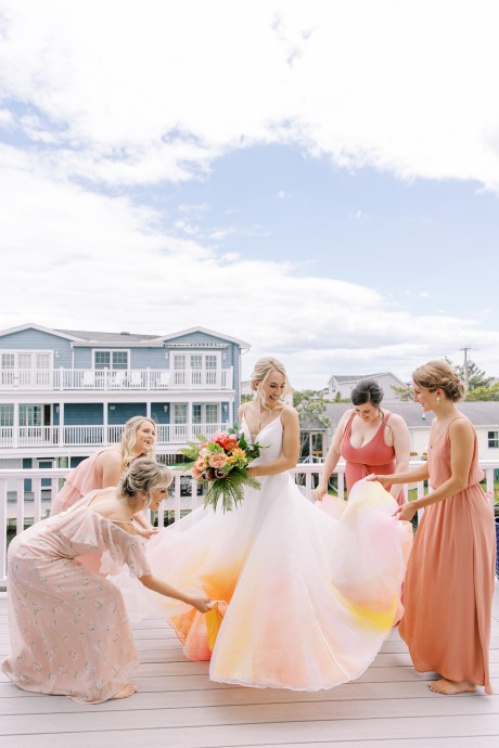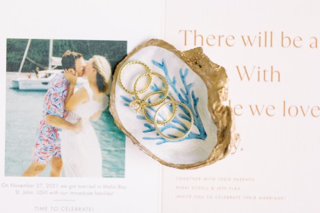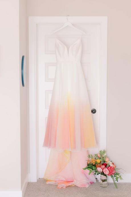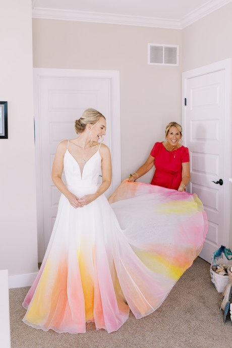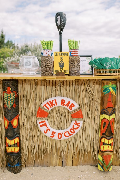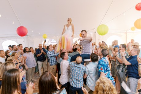 One special touch at the wedding was a giant tiki bar with cheesy signs that my dad built, and we served Pain Killers with nutmeg as our signature drink. Additionally, my dress is one of my favorite things in the world—I am a wedding photographer and photographed a wedding at IRLSS in 2018 for local artist Jane Merkel. That was my introduction to IRLSS and Jane’s work; I fell in love with both. I knew a white dress wasn’t my vibe, so I commissioned Jane to paint my dress in vibrant colors! I’m obsessed and wish I could wear it every day!"