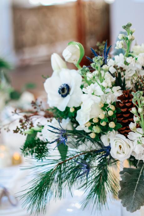 • Winter — Give us sugared cranberries, gold glitter and all the twinkle lights! Incorporate the existing holiday decor into your theme, or add touches of winter berries and greenery to your favorite blooms.