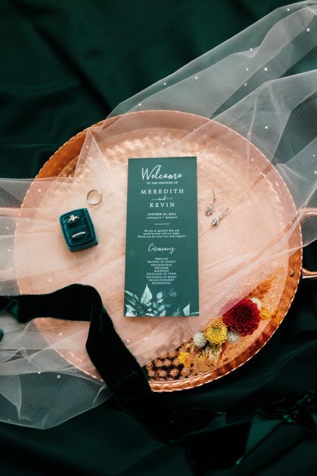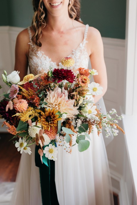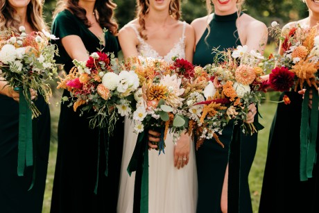 • Autumn — Warm copper, rich greens, burgundy and gold. Go for an opulent feel in your autumn theme with hand-tied bouquets and luxurious textures like velvet and leather.