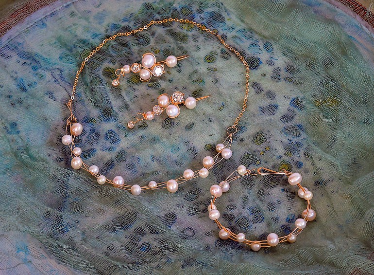 Klein’s designs also lend themselves beautifully to wedding wear. For the bridal party, colored semi-precious stones and Swarovski crystals will compliment various color themes and attire styles. For the bride, amongst an array of remarkable options, we fell in love with this exquisite woven gold and pearl set.